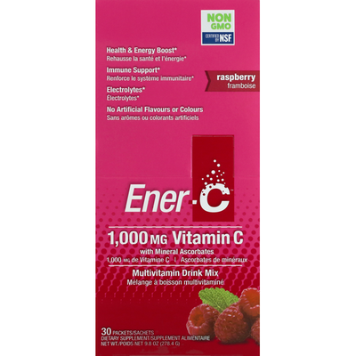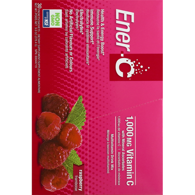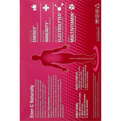 Dietary Supplement. Multivitamin drink mix. No artificial flavours or colours. Gluten free. Vegan. Non GMO certified by NSF. NSF Non-GMO True North: www.nsfnongmo.org. Health & energy boost. Immune support. Electrolytes. Ener-C Naturally: So much more than vitamin C, Ener-C is a delicious effervescent multivitamin drink mix flavoured with real fruit juice powders. Ener-C's 100% non-GMO formula provides immune and thyroid support, B vitamins, electrolytes and so much more! Boost of energy. Maintain immunity. Boost your electrolytes. Daily multivitamin. www.tryenerc.com. (These statements have not been evaluated by the Food and Drug Administration. This product is not intended to diagnose, treat, cure, or prevent any disease.) Made in Canada.